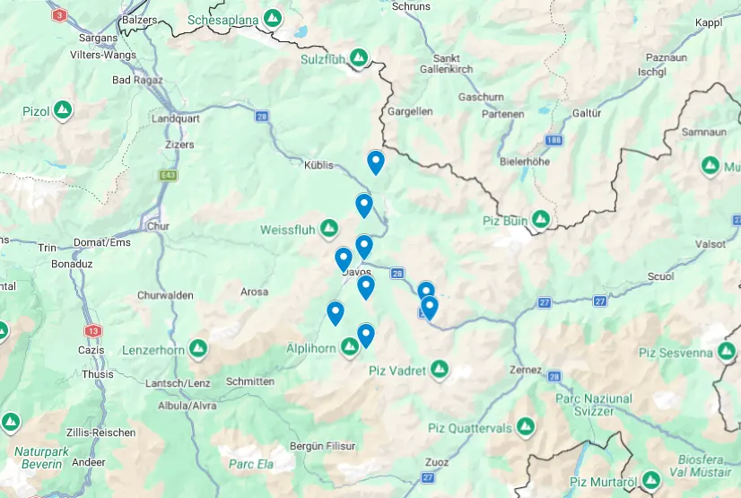 For your convenience, we’ve created an interactive map showing the 10 best hikes in the Davos Klosters area. The pin drop indicates the trailhead for the respective hike.