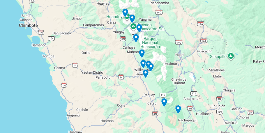 For your convenience, here’s an interactive map showing the best day hikes in Huaraz, Peru.